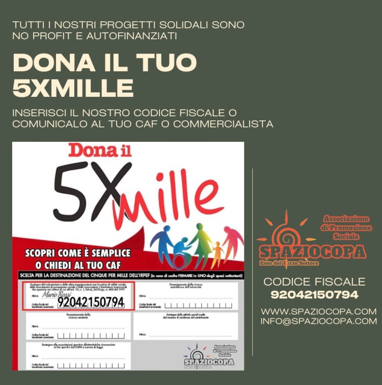 Il 5 per mille è un’opportunità importante per tutti i cittadini italiani di destinare una parte delle proprie tasse ad un associazione o a un ente di volontariato. SostIeni SpazioCopa e i nostri progetti, ti basterà inserire il nostro CF 92042150794 nella sezione dedicata al 5 per 1000 “Sostegno delle organizzazioni non lucrative di utilità sociale”