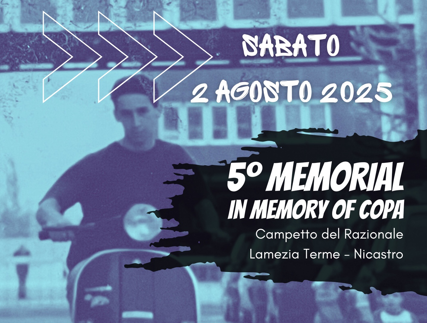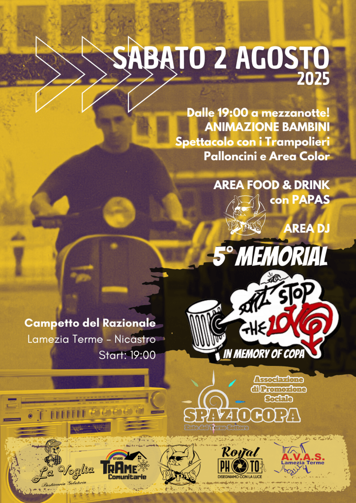 Non mancate a questa quinta edizione del Memoriale Don’t Stop The Love, un evento che onora la memoria di Copa e celebra il suo straordinario contributo all’arte e alla musica. L’appuntamento è per sabato 2 agosto 2025, dalle 19:00 nel quartiere Razionale di Lamezia Terme. Unisciti a noi per rendere omaggio a un amico, un pioniere, un b-boy e per condividere un’esperienza di arte, musica e comunità che siamo certi rimarrà impressa nei cuori di tutti.